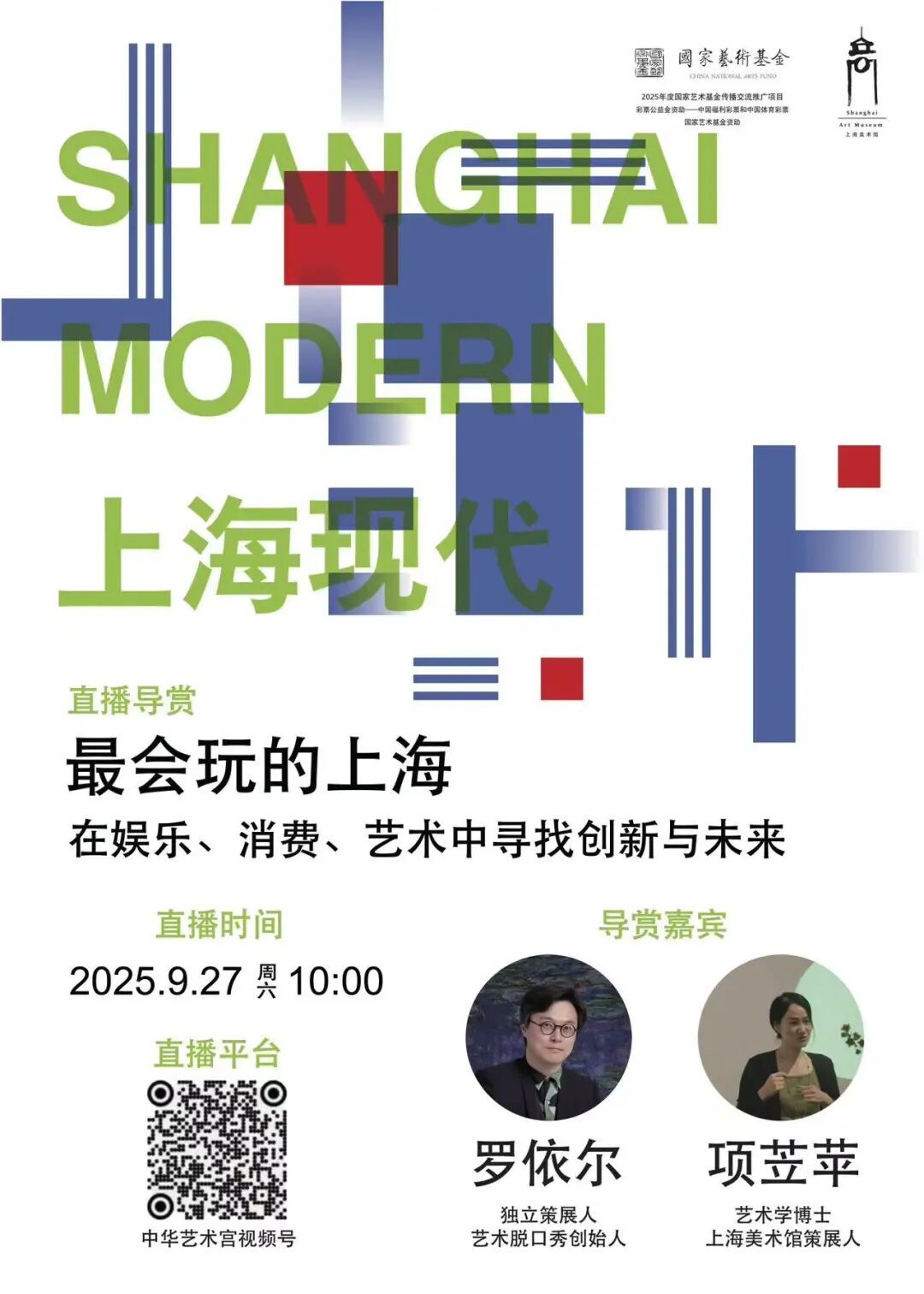 上海美术馆年度大展“上海现代”正如火如荼地热展,一场关于上海文化嬗变的视觉盛宴正等待着你的探索。9月27号上午10点,艺术脱口秀创始人罗依尔将携手“上海现代”策展人项苙苹,为大家带来一场别开生面的展览主题线上导览——《最会玩的上海——在娱乐、消费、艺术中寻找创新与未来》。