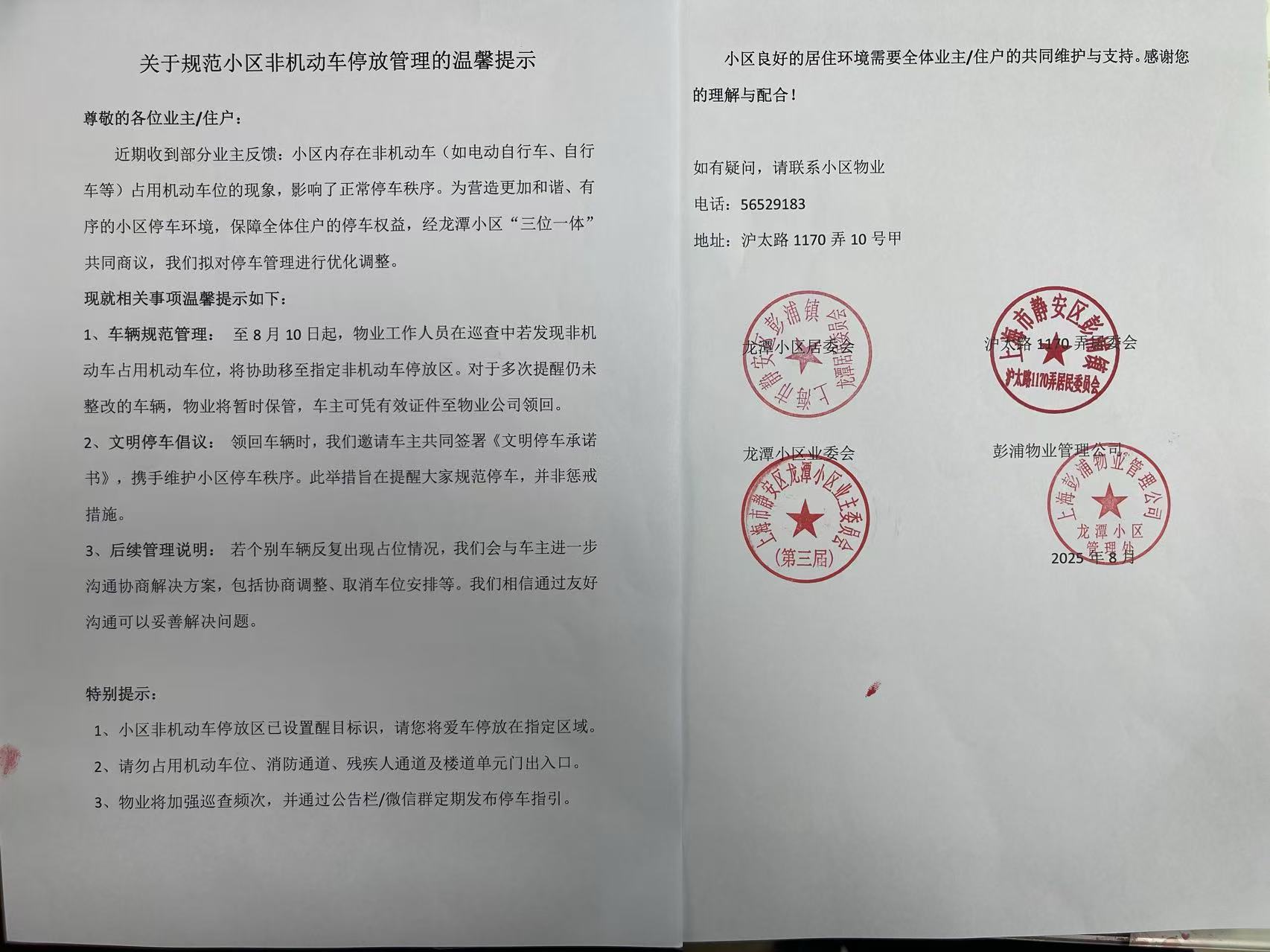 “关键是,‘怎么一起管’?”沪太路1170弄居委会书记秦侃告诉记者,在“百日攻坚”工作中,“三位一体”多次组织联席会议协商治理方案,共同制定了《关于规范小区非机动车停放管理的温馨提示》,明确物业将加强巡查,对占位非机动车实施“先移车、后承诺”的处理流程。