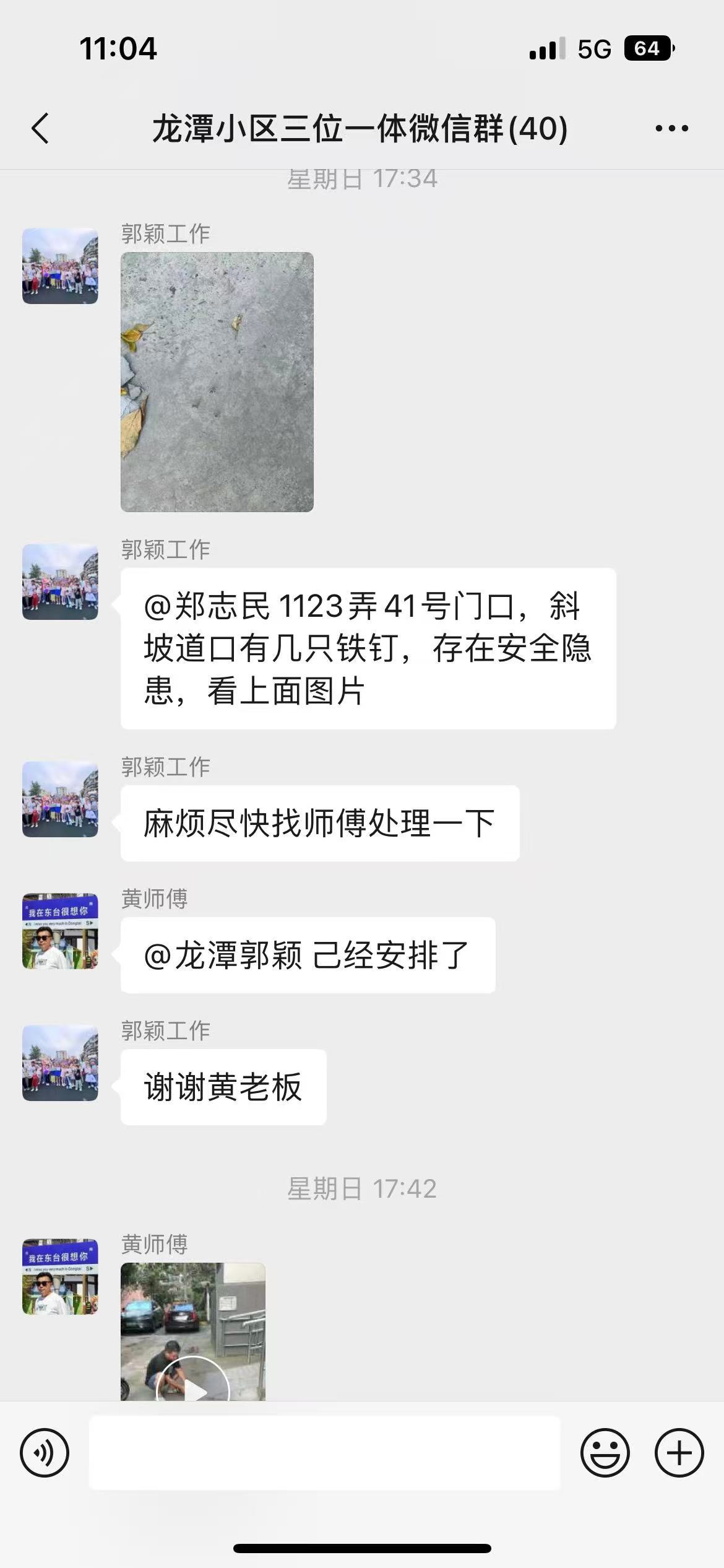 如今,龙潭小区已形成了“三位一体”每日巡视小区机制,发现问题及时处理,形成“发现—交办—处置—反馈”闭环处置流程,并开展实施双周联合接待日,让居民求助有门、解惑有道。