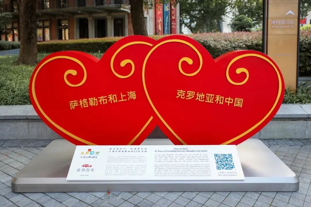 鲜红的心形上绘有精致的纹饰,并点缀以小巧的镜子,象征着团结与友谊。两个相连的红心——一个写着“萨格勒布”和“上海”,另一个写着“克罗地亚”和“中国”——传递着同样的讯息:即使相隔遥远,我们依然可以共享温暖、联系与相互尊重。正如人们常说的,海内存知己,天涯若比邻。