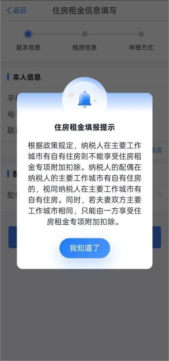2.点击“住房租金” -选择“扣除年度” -选择配偶情况-阅读温馨提示并点击“我知道了”。