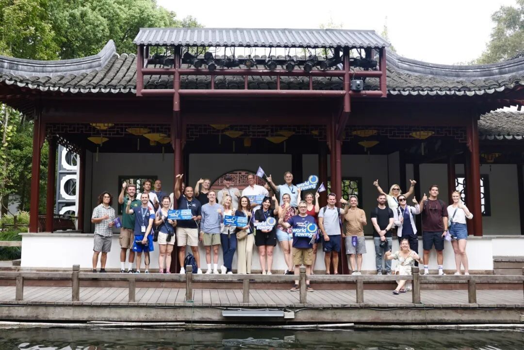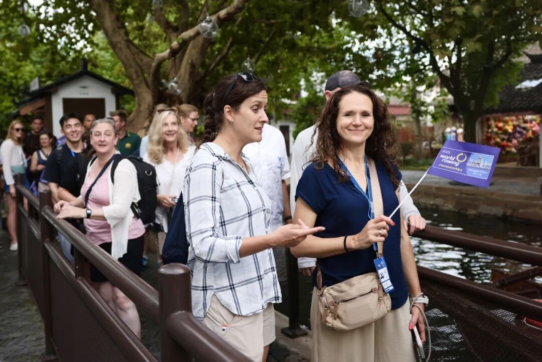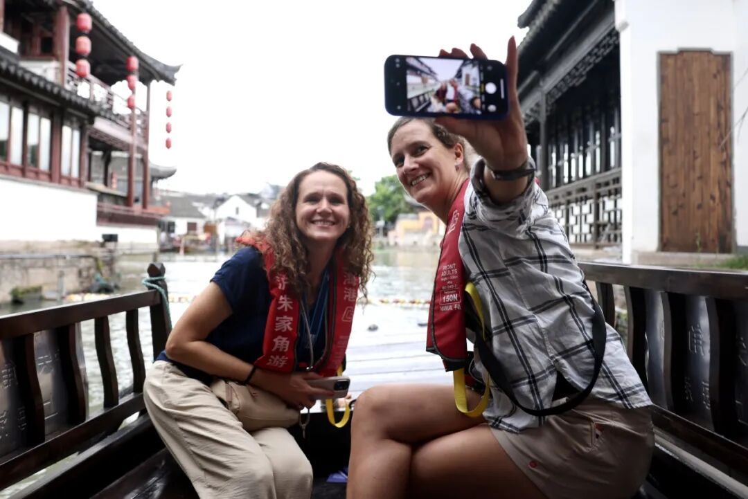 在最具特色的水上体验环节,见惯了赛艇航道上碧波翻涌的国际赛联新闻团队与媒体代表们同样按捺不住兴奋。橹声欸乃,水波荡漾,他们随手记录两岸白墙黛瓦的民居,一边好奇地观望蜿蜒的水巷、形态各异的石桥构成流动的水墨画卷。