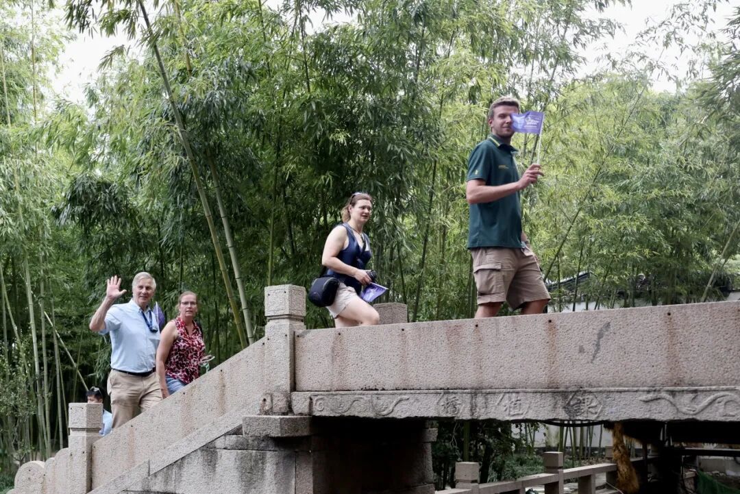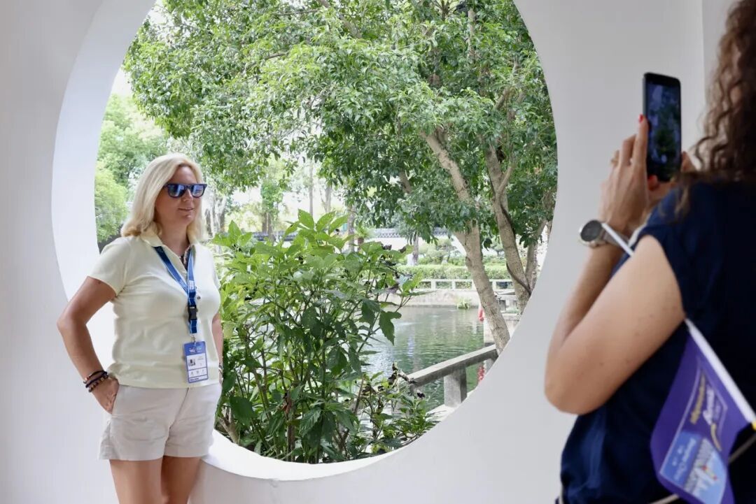 在这趟江南之旅中,大家首先造访了始建于1912年的江南园林课植园。从宽敞的正厅到蜿蜒的花园小路,从爬上太湖石的假山到投喂一池锦鲤,许多首次来到中国的外国媒体代表兴致勃勃地感受着古典园林独特魅力。来自澳大利亚赛艇协会的Patrick直言,这是他第一次来到中国,这些古建筑和园林特别吸引自己,“透过它们,我们能看到过去的历史”。