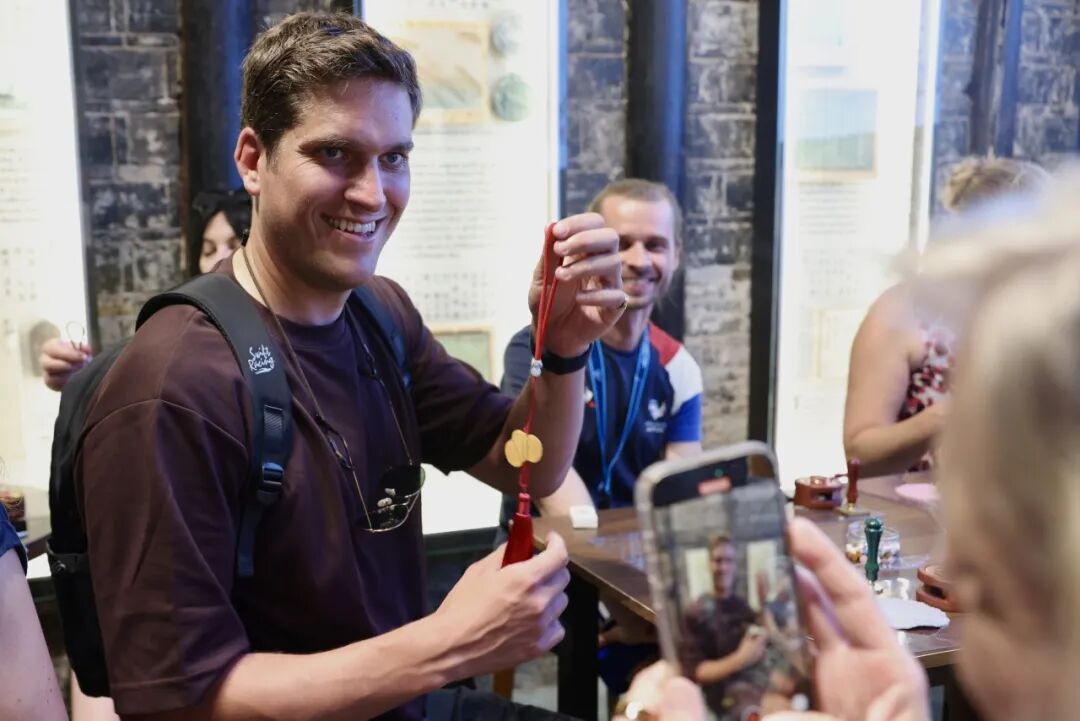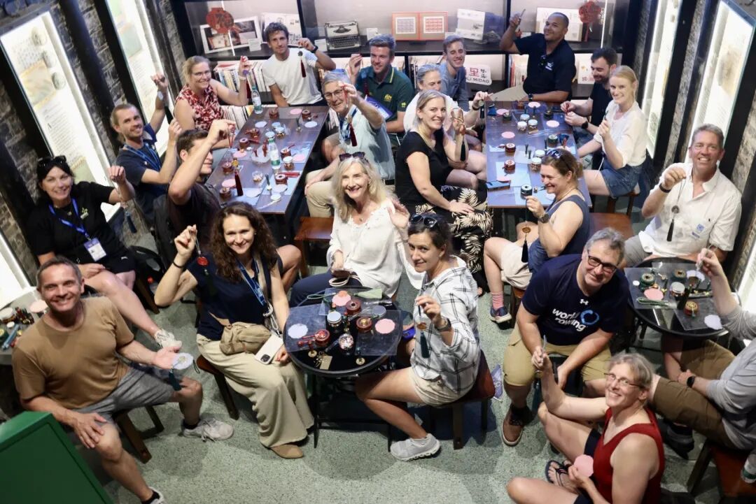 而当一行人来到1903年的大清邮局,传统火漆封蜡制作中国结挂坠的活动也让众人跃跃欲试。在现场工作人员的指导下,他们小心地融化不同颜色的火漆蜡块,创作属于自己的中国结。“现在它是我的啦”,来自希腊的女记者Gita得知可以带走这份独一无二纪念品时直呼惊喜,“这太有意思了!我要把它带回家。”而来自波兰赛艇协会的Julia也在现场精心挑选了一张风景明信片,亲笔写下自己的水乡记忆,投递到复古的邮筒里,与远方的亲友分享喜悦。
