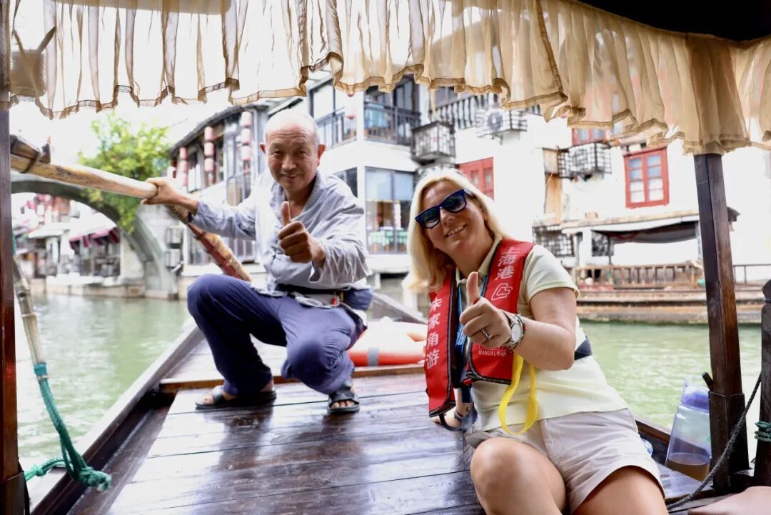 挥舞着小旗,拿着手机随处拍,还不忘向河道上的摇橹船挥手致意……9月23日下午,朱家角古镇迎来了一群特别的客人——来沪参与2025世界赛艇锦标赛的国际赛联新闻团队与媒体代表。