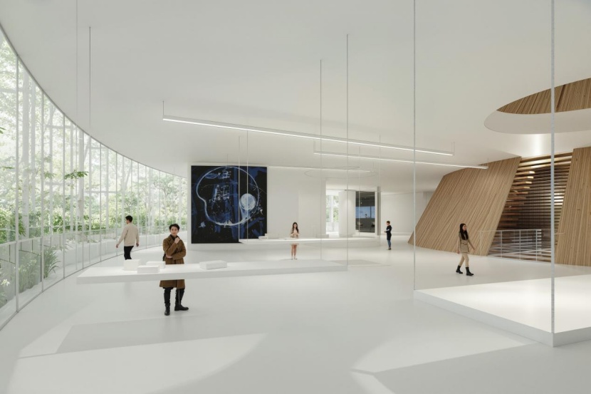 建筑形体东西两侧,回应不同的城市界面——西侧矩形体块高效收纳各功能空间,维护城市道路,连续城市界面;东侧圆润弧面展厅向公园展开,270度全景模糊边界。四层挑空的锥形中庭是建筑的核心空间,随着时间,顶部泄入的自然光顺着表面缓缓流动。