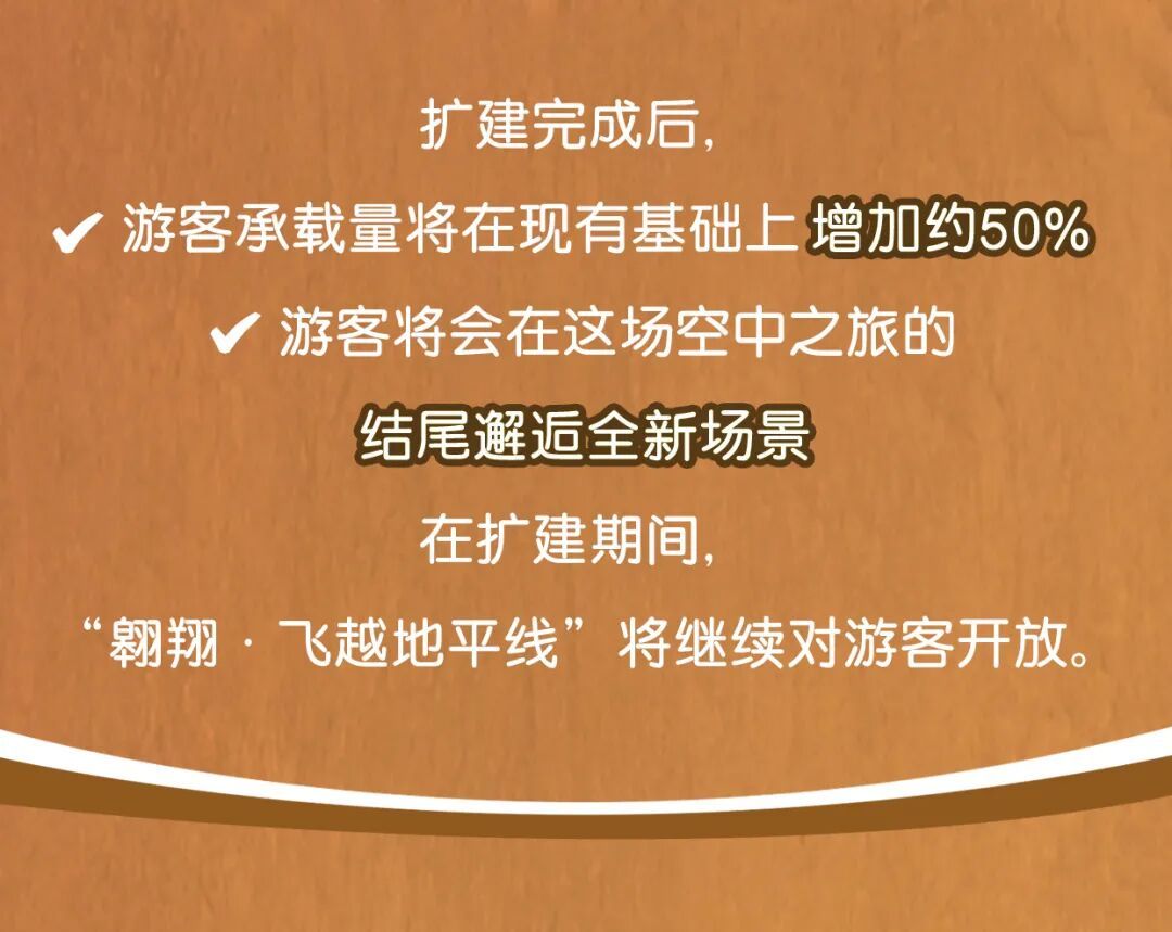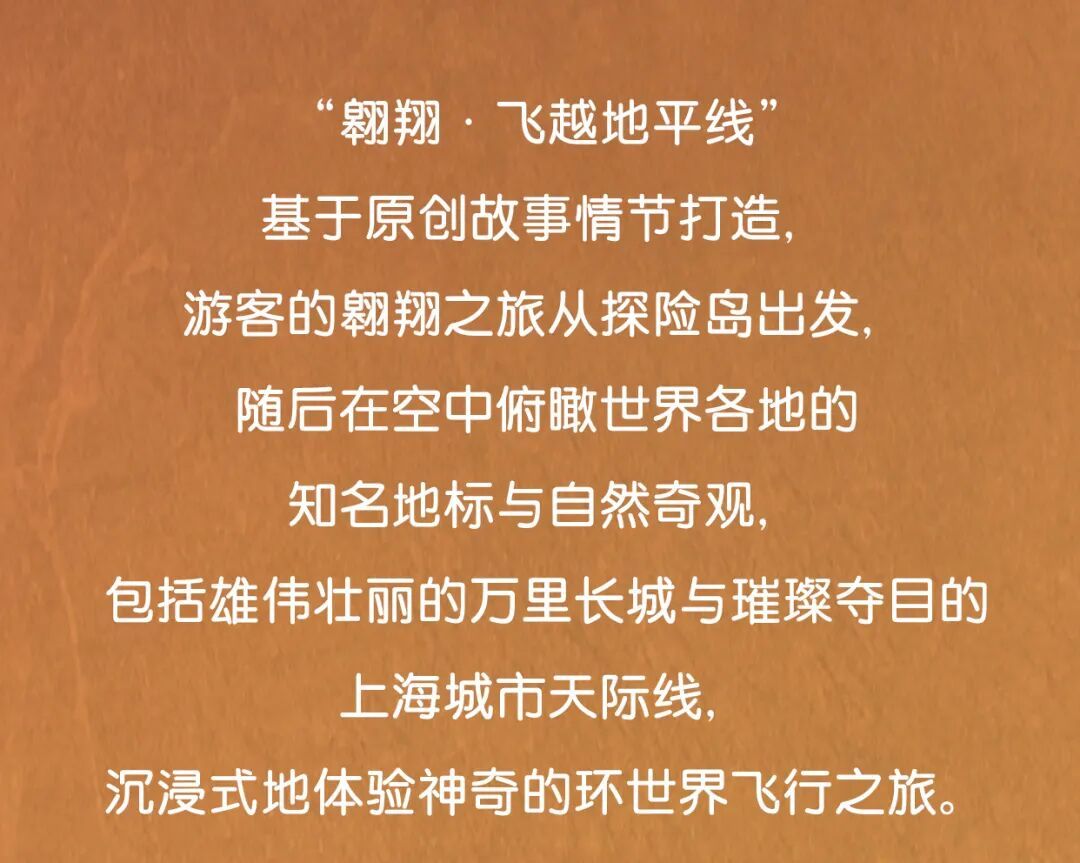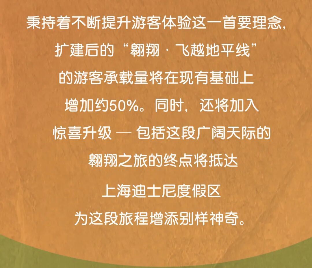 上海迪士尼度假区介绍,上海迪士尼乐园标志性的主题景点——“翱翔·飞越地平线”迎来扩建,扩建后的“翱翔·飞越地平线”的游客承载量将在现有基础上扩充约50%,游客还将会在这场空中之旅的结尾邂逅全新场景,发现特别惊喜。在扩建期间,“翱翔·飞越地平线”将继续对游客开放。详见↓