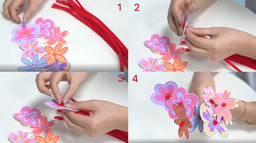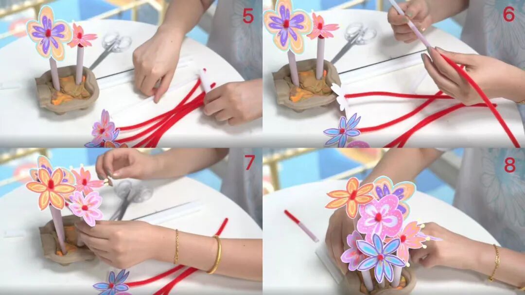 接着拿出扭扭棒,将扭扭棒穿过小花的中心位置,随后将扭扭棒顶端固定。一朵小花就完成啦。