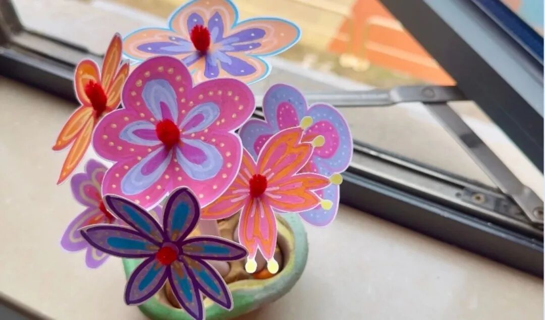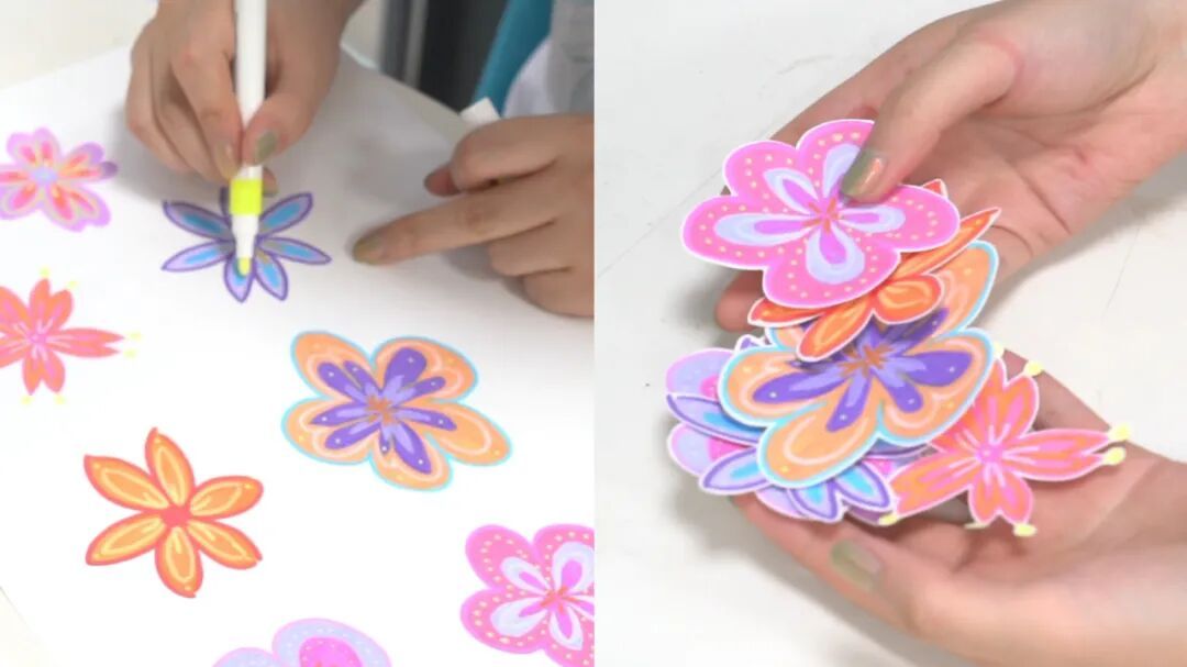 首先在白纸上用彩色丙烯马克笔画上小花,涂色后用剪刀把它们都剪下来。