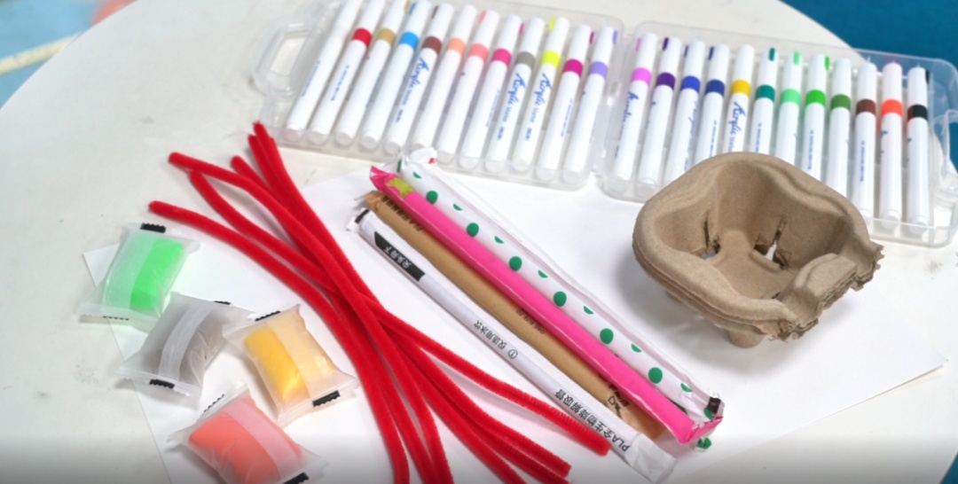 彩色丙烯马克笔、一次性吸管、扭扭棒、轻型粘土、剪刀、白色铅画纸、外卖咖啡杯拖