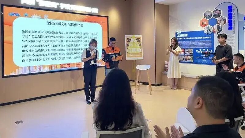 活动在商户和骑手代表相约发布的《豫园商圈文明配送倡议》中迎来高潮,商圈各方的善意努力凝结为一次积极向善的约定:规范停放、耐心沟通、准时出餐,每一项配送中的文明行为都将成为助力商圈营商环境和经营行为提升的有效举措。