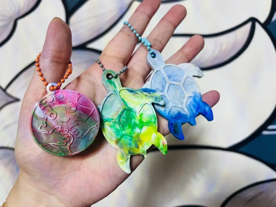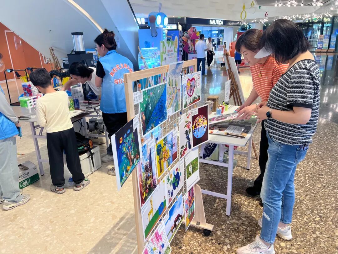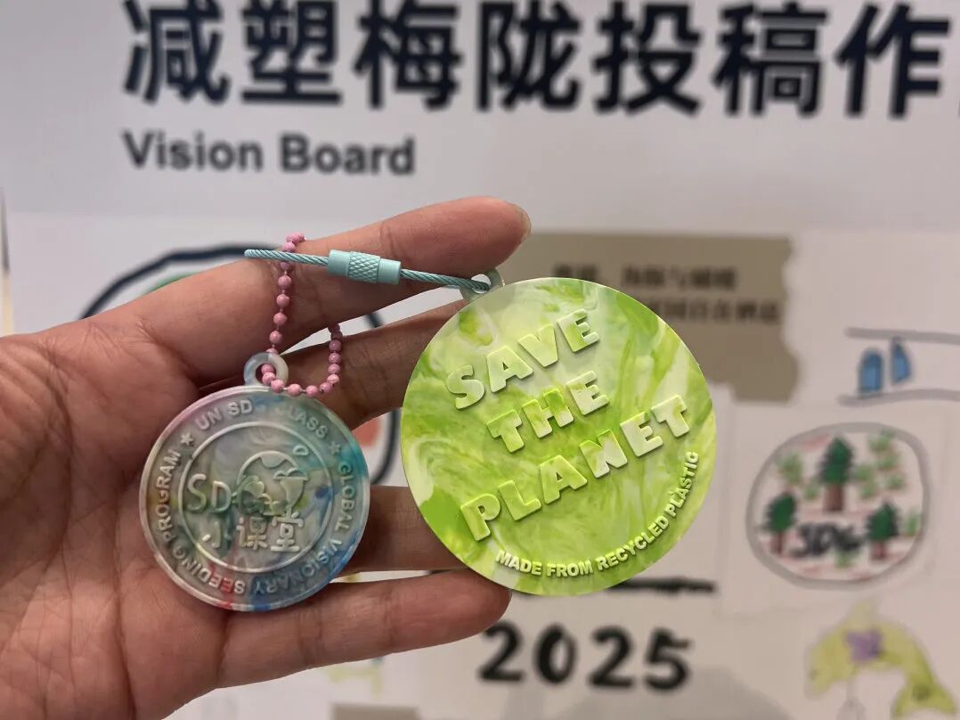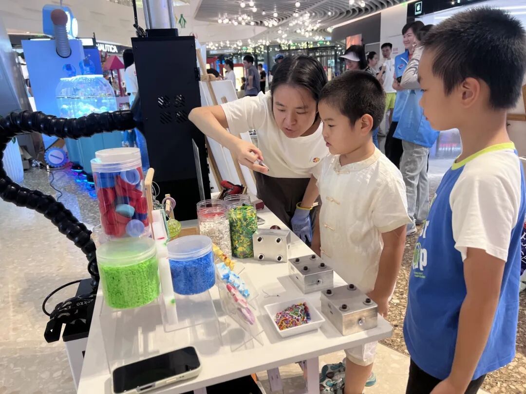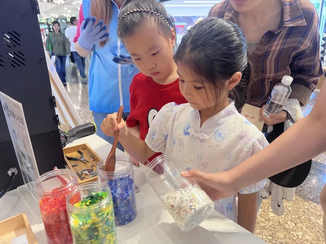 互动区成了全场最热的打卡地:再生塑料压模体验台前围满了人,孩子们自己动手,将废弃塑料颗粒,通过再生压模,亲手体验制作减塑文创挂件。现场还展示了通过活动征集,孩子们设计创作的优秀图案作品。