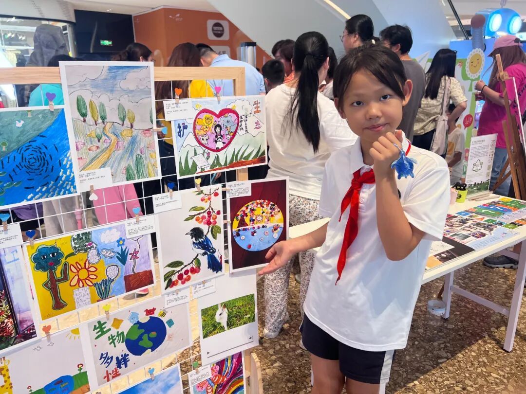 孩子们的能量超乎想象!现场展出的文明实践小课堂手工实物作品、植物种子、设计稿、vlog……都是这场实践活动最酷的收获!“向野而生”投稿13幅,“减塑梅陇”文创设计38幅——黏土地球、纸艺熊猫、循环标志小龟……每一个作品都装着小设计师对绿色地球的爱心。展架上,一张张标签背后,是一个个未来的“低碳文明小小实践者”。“这是我的作品,我用废弃的纽扣拼成了彩色的地球,我希望大家都能保护环境,希望海洋湛蓝,花草常绿。”更有小作者们来到了现场,为自己参展的作品打call。