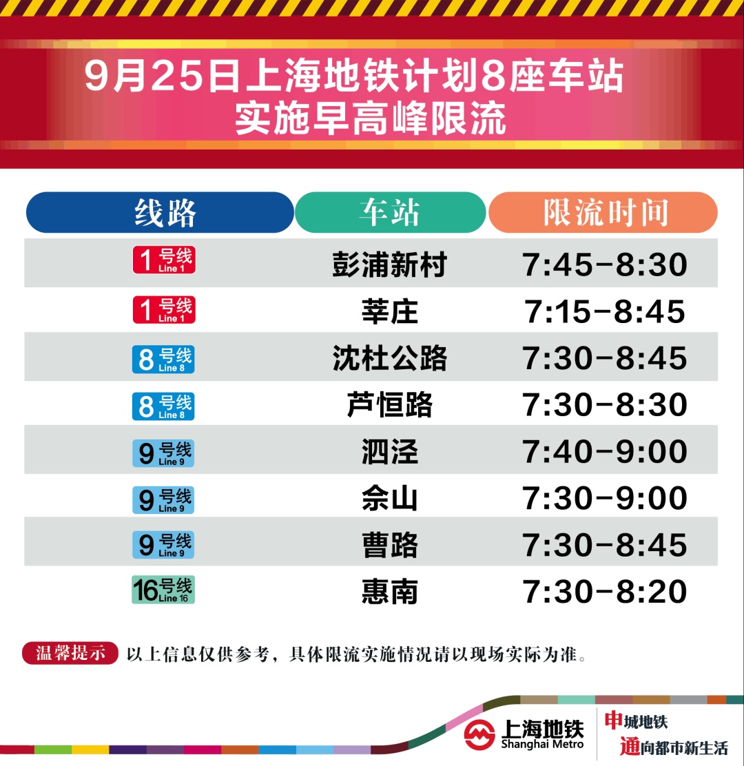 【编辑】程小程9月25日,上海地铁早高峰限流措施将继续实施,届时将有8座地铁站早高峰计划限流。