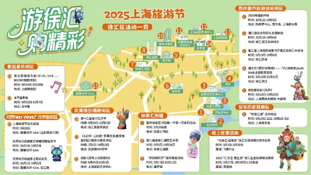 中秋遇国庆,文旅热潮燃!2025上海旅游节期间,徐汇区以“游徐汇·购精彩”为核心主题,深度挖掘“都市旅游+时尚消费”双重潜力,创新构建“日间+夜间、线上+线下、场内+场外”三维时空游线。从光影造梦的传统节庆到次元碰撞的元界狂欢,再到巨星云集的演艺盛宴,三大特色场景层层加码,更有住宿、消费双重优惠券助力,为市民游客打造一场“白天玩到入夜,线上嗨到线下”的金秋文旅盛宴。