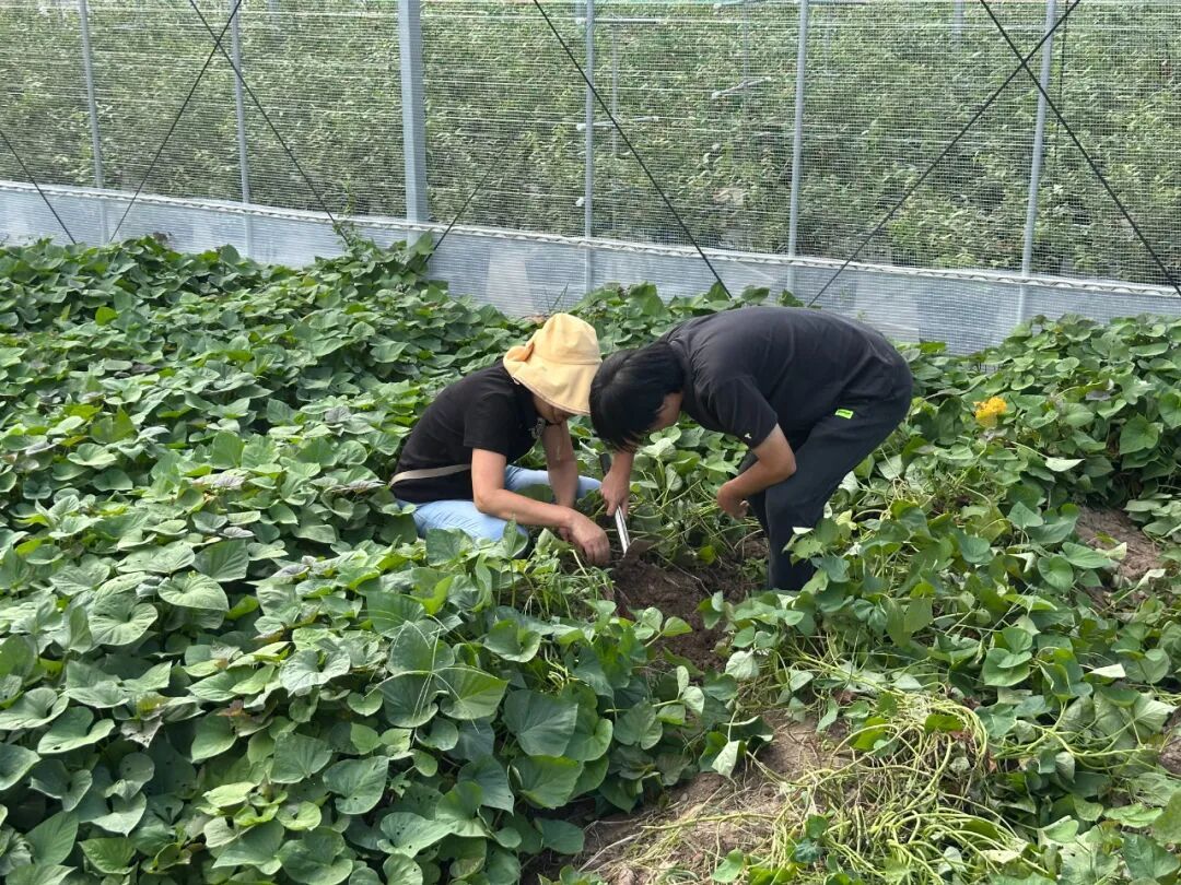 9月22日下午,记者走进农庄,只见4块红薯地呈“田字格”分布,翠绿的薯藤爬满地面。工作人员手持小铲子,顺着薯藤根部轻轻松动周围土壤,再用手一拽,表皮紫红的糖心薯便成串地被拔了出来。记者掰开一根刚挖出的糖心薯,果肉细腻,呈橙黄色,凑近还能闻到淡淡的泥土清香。