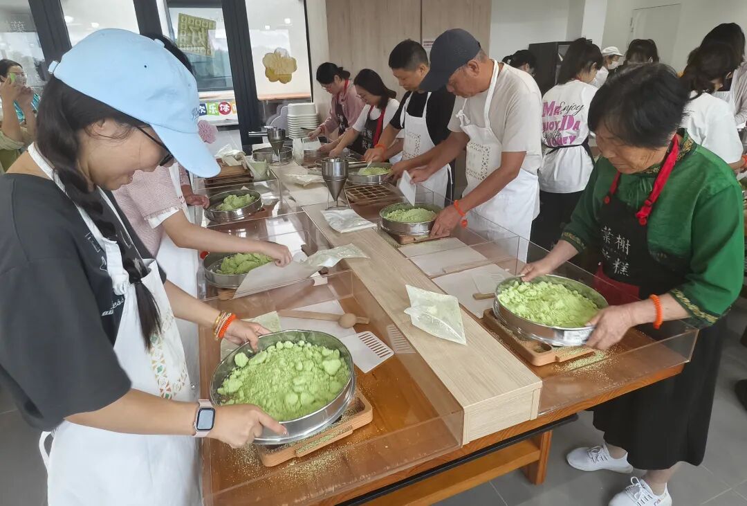 随后,大家又一起来到八十八亩田非遗美学空间,跟随着做糕师傅们的指导,现场体验制作传承百年的非遗叶榭软糕。筛粉、填馅、刮平、翻模……望着自己精心手制的新鲜米糕,不少人还饶有兴致地用镜头拍摄下来,定格这一难忘瞬间。