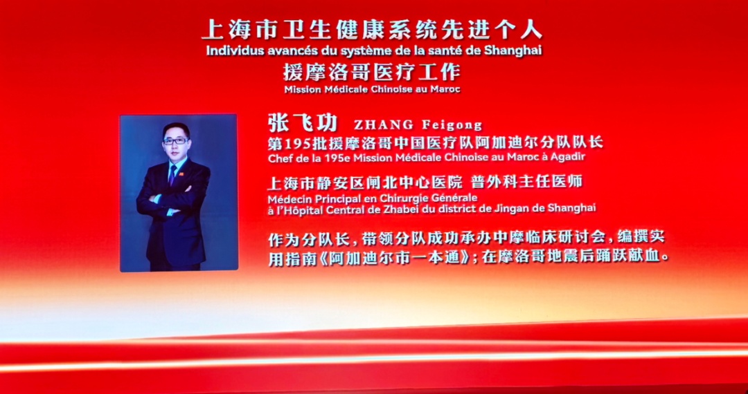 今年正值中国向摩洛哥派遣援外医疗队50周年。在近日上海举办的“山海同心,大爱无疆”援摩洛哥中国医疗队派遣50周年主题活动中,第195批援摩洛哥中国医疗队阿加迪尔分队队长、上海市静安区闸北中心医院外科副主任张飞功医生,荣获“上海市卫生健康系统先进个人”称号。