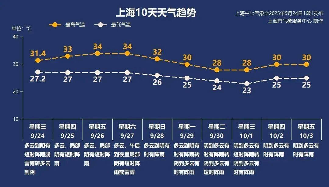 周五到周日,受副热带高压影响,上海以多云天气为主,有短时阵雨或雷雨,气温上升,预计最高气温在34℃附近。9月下旬上海这么热,还是比较少见的。