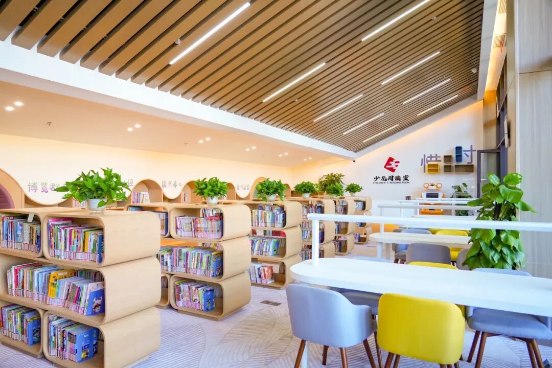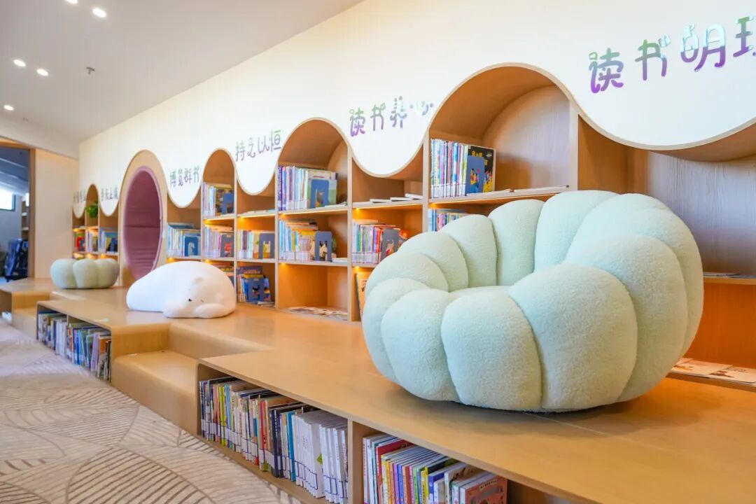 与成人阅览区相对的少儿馆则充满了童趣,整体色调采用明亮活泼的暖色,书架高度、桌椅尺寸、阅读灯光等均根据儿童的使用习惯进行了精心设计。同时,区域内还增设了各类趣味摆件,丰富多样的墙面、舒适可爱的靠垫以及小狮子造型的自助借阅机,为孩子们打造了一个温馨快乐的阅读空间。