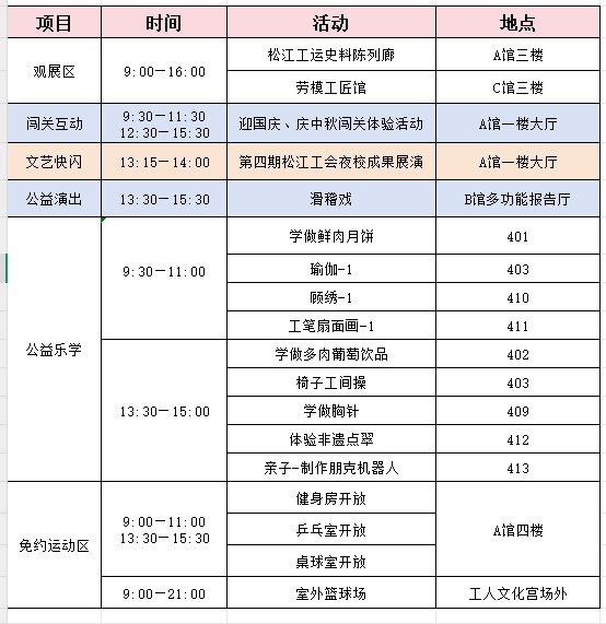 本周六,工人文化宫将开展“学做鲜肉月饼”“养生瑜伽”“顾绣”“工笔扇面画”“学做多肉葡萄饮品”“椅子工间操”“学做胸针”“体验非遗点翠”“亲子-制作朋克机器人”9门课程活动,请成功预约的职工朋友们准时参加。
