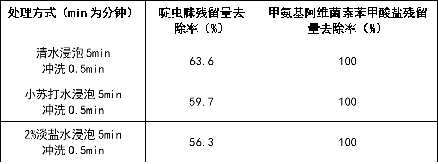 从测试数据看,这几种清洗方式依旧可以完全去除青菜中低浓度的甲氨基阿维菌素苯甲酸盐,但是当青菜中含有较高含量的啶虫脒时,几种清洗方式的去除效果呈现出了小差距。2%淡盐水和小苏打水的去除效果虽说也不错,但还是略逊于清水。尤其是淡盐水,其效果相当于不浸泡,仅用清水冲洗半分钟,并没有表现出额外的优势。