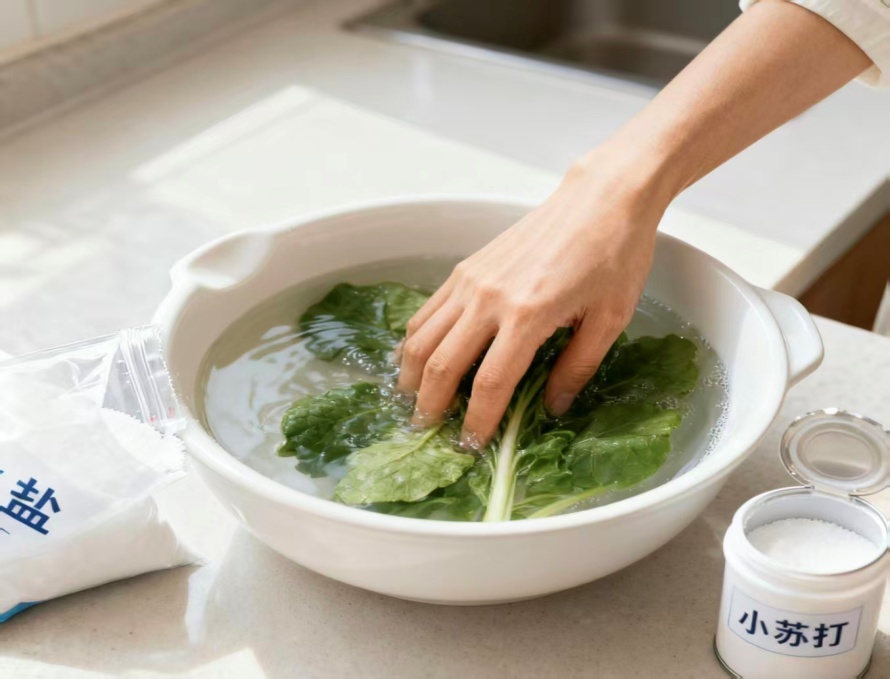 综合看,淡盐水、小苏打水这些“传统洗菜妙招”在去除绿叶菜农残清洗时并没有展现出优于清水的效果,反而可能影响绿叶菜农残去除效果。所以在洗绿叶菜的时候,认准“清水浸泡+流水冲洗”,就是最高效的选择。