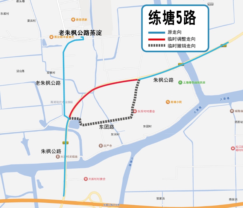 因练塘镇即将在东厍村(东团路)举办茭白节暨古镇文化旅游节,节日期间东团路段通行压力较大,易造成道路拥堵,为保障公交车辆通行安全,区建管委计划于9月27日首班车起临时调整练塘5路走向及站点,具体如下: 一、调整时间 2025年9月27日至10月8日。 二、走向及站点调整 原走向:上行自练塘汽车站起经老朱枫公路、章练塘路、蒸夏路、松蒸公路、贞溪北路、老松蒸公路、蒸浦路、蒸浦支路、东圩路、朱枫公路、东团路、朱枫公路(至大浜村折返)、老朱枫公路至老朱枫公路蒸淀止;下行循原线返回。 临时调整为:上行自练塘汽车站起经老朱枫公路、章练塘路、蒸夏路、松蒸公路、贞溪北路、老松蒸公路、蒸浦路、蒸浦支路、东圩路、朱枫公路(至大浜村折返)、老朱枫公路至老朱枫公路蒸淀止;下行循原线返回。 站点调整:临时撤销东团路东厍村(双向)、东团路庄严寺(双向)、东团路老朱枫公路(双向)3组站点;临时增设朱枫公路东团路(双向)。 区建管委将根据道路情况及时恢复原线路走向,为此给广大乘客带来不便敬请谅解并请相互转告! 特此通告 青浦区建设和管理委员会 2025年9月24日 资料:区建管委