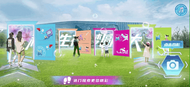 在中央草坪找到“任意门”装置,通过AR小程序引导进入最佳观赏位。迈入门框的那一刻——花朵骤然绽放,粉、紫、白交织烂漫,未来飞行器穿梭其间,泡泡轻柔飘荡,科技与自然在此完美融合,呼应“科创生花”的浪漫主题。