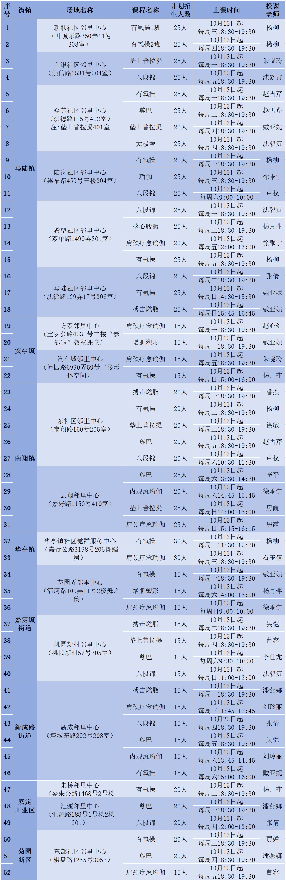 8个街镇、17个邻里中心、12个项目、52个班次,为你量身打造专业又科学的健身课堂!从八段锦到燃脂搏击,从活力尊巴到舒缓瑜伽,总有一款能戳中你的运动热情。