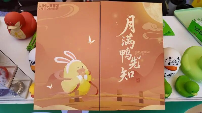 今年中秋,以一杯柠檬茶、一只小黄鸭形象出圈的品牌——林里,推出了一款林里·月满鸭先知礼盒,礼盒由奶酥抹茶、青梅龙井、蛋黄莲蓉、西梅碧螺春等4款口味的月饼组成,并随礼盒附赠了中秋形象的玉兔鸭和一盒臻品大红袍。