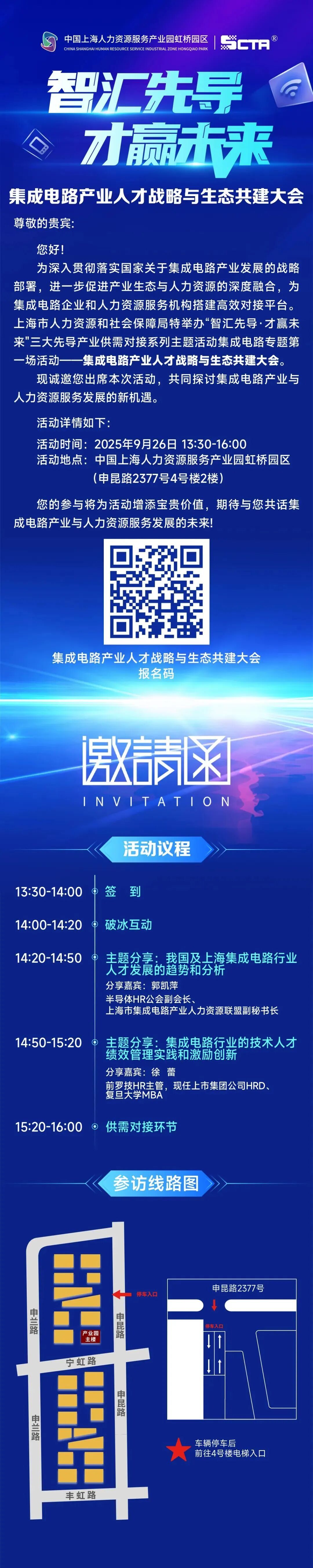 为深入贯彻落实国家关于集成电路产业发展的战略部署,进一步促进产业生态与人力资源的深度融合,为集成电路企业和人力资源服务机构搭建高效对接平台。9月26日,由上海市人力资源和社会保障局主办,中国上海人力资源服务产业园虹桥园区承办,上海市集成电路行业协会、上海市计算机行业协会联合支持的“智汇先导 • 才赢未来——集成电路产业人才战略与生态共建大会”即将在中国上海人力资源服务产业园虹桥园区隆重举办!