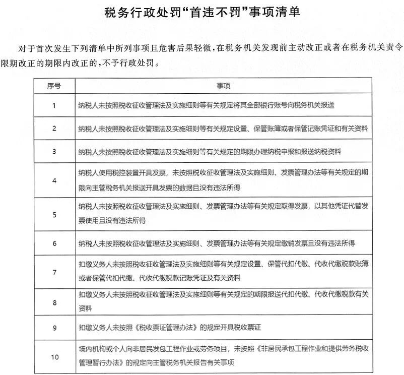 国家税务总局关于发布《税务行政处罚“首违不罚"事项清单》的公告