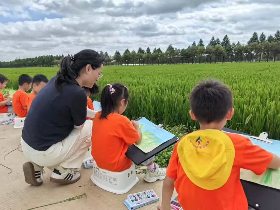 随后,一场“稻田写生”在田埂边展开。志愿者老师为孩子们分发画板、彩笔和速写本,鼓励他们以“秋野稻田会”为主题创作。“我要画金灿灿的稻穗!”“我想画稻草人守护稻田!”孩子们趴在田埂上,用稚嫩的笔触勾勒稻浪、稻草人、蝴蝶等元素,将眼前的丰收美景定格在纸上。