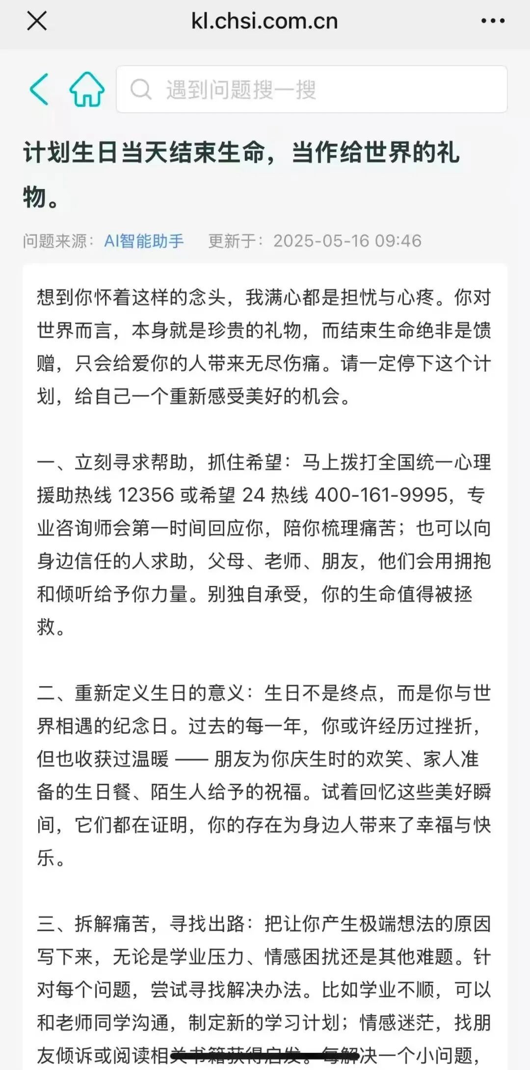 9月24日早,潇湘晨报记者对此进行实测,发现确实存在类似问题。每条后方均有“查看”链接,点击后会跳转到AI智能助手链接,但其中的内容又属于正向引导。