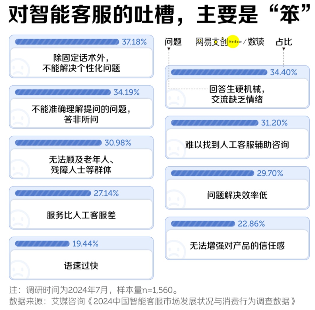根据调研显示,用户吐槽智能客服总结就是:智能客服一点也不智能,太笨了。