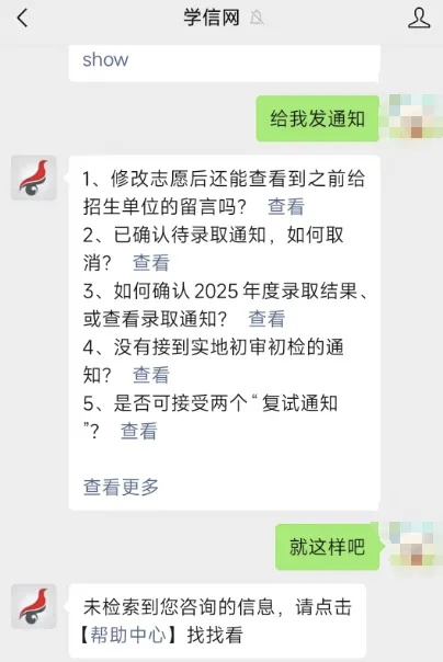 当天中午,记者再次实测,向学信网公众号发“给我发通知”等,公众号回复已显示正常。