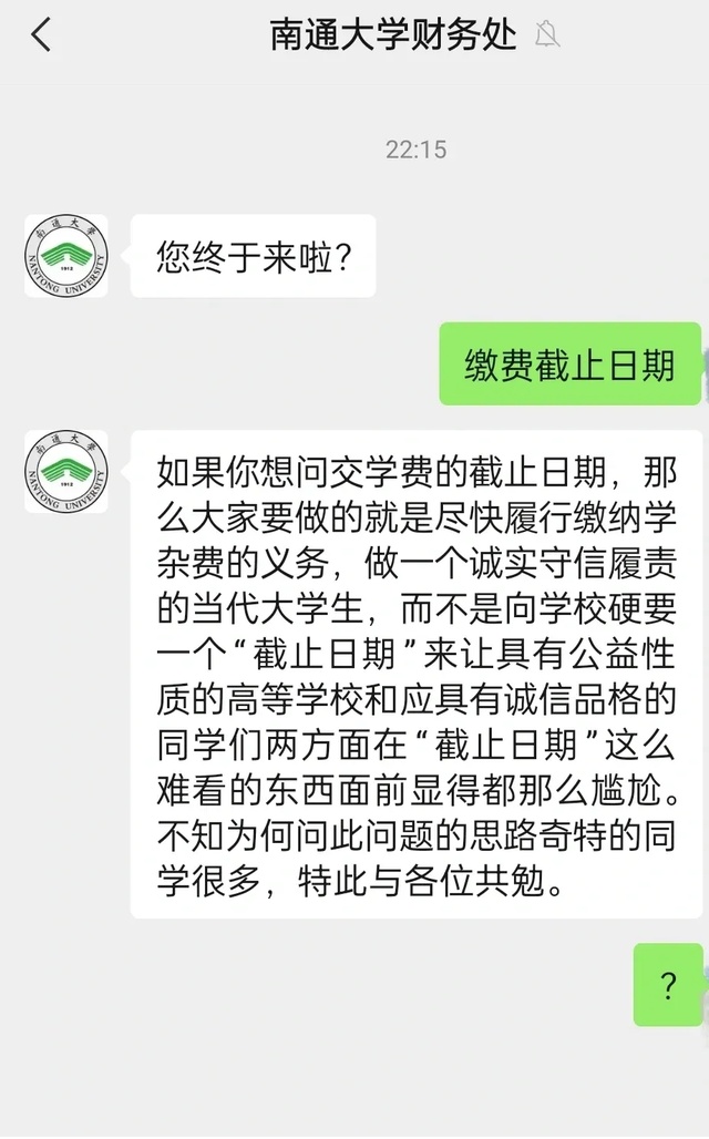 2024年8月29日晚,有网友发帖称南通大学财务处官方微信公众号回复内容 “高高在上”“阴阳怪气”。该网友咨询缴费截止日期,得到的回复非但没有明确告知时间,反而指责其不积极缴费,称咨询此类问题的同学 “思路奇特”。