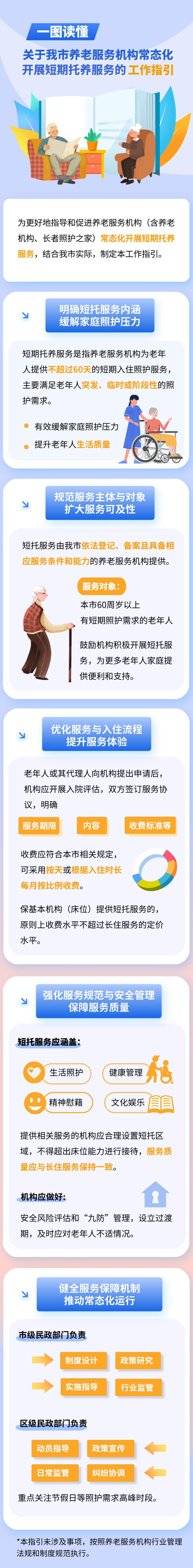 为更好满足老年人家庭的短期照护需求,缓解家庭阶段性照护压力,上海市民政局印发《关于我市养老服务机构常态化开展短期托养服务的工作指引》,推动养老服务机构规范、有序、长效开展短期托养服务,顺应当下整合型养老照护服务新需求,引导养老消费新方式。详见↓