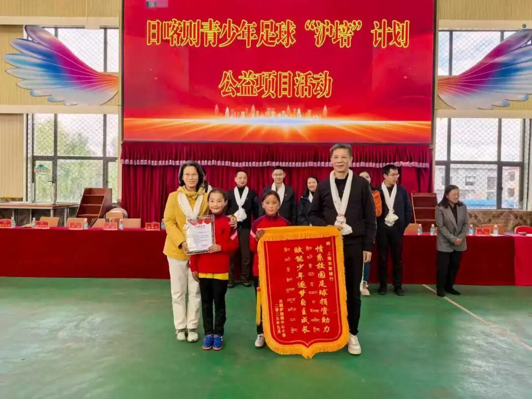在“沪培”交流计划启动后的第二天,上海农商银行一行前往海拔约4400米的萨迦县萨迦镇中心小学,详细了解学校基本情况、历史沿革及办学特色,并向学校捐赠相关物资,以实际行动为校园足球运动的发展添砖加瓦。萨迦镇中心小学回赠证书及锦旗,上海农商银行一行与校园足球队伍进行合影。