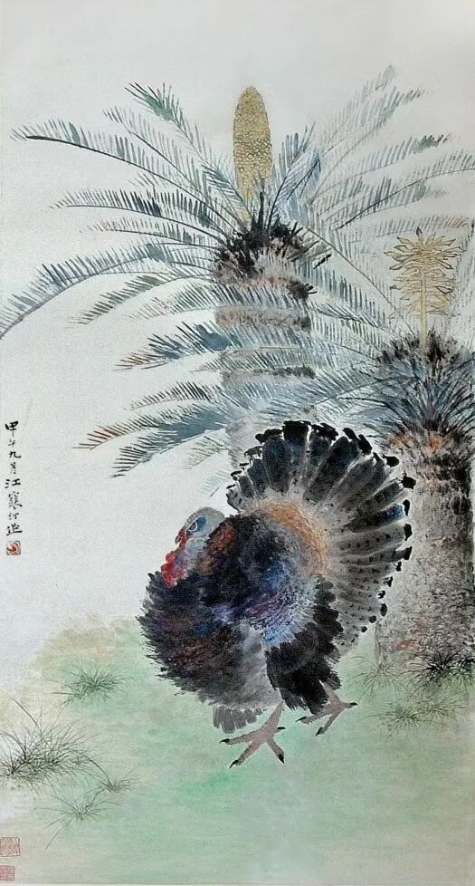 江寒汀《铁树·火鸡》150cmx81cm 纸本设色 1954年