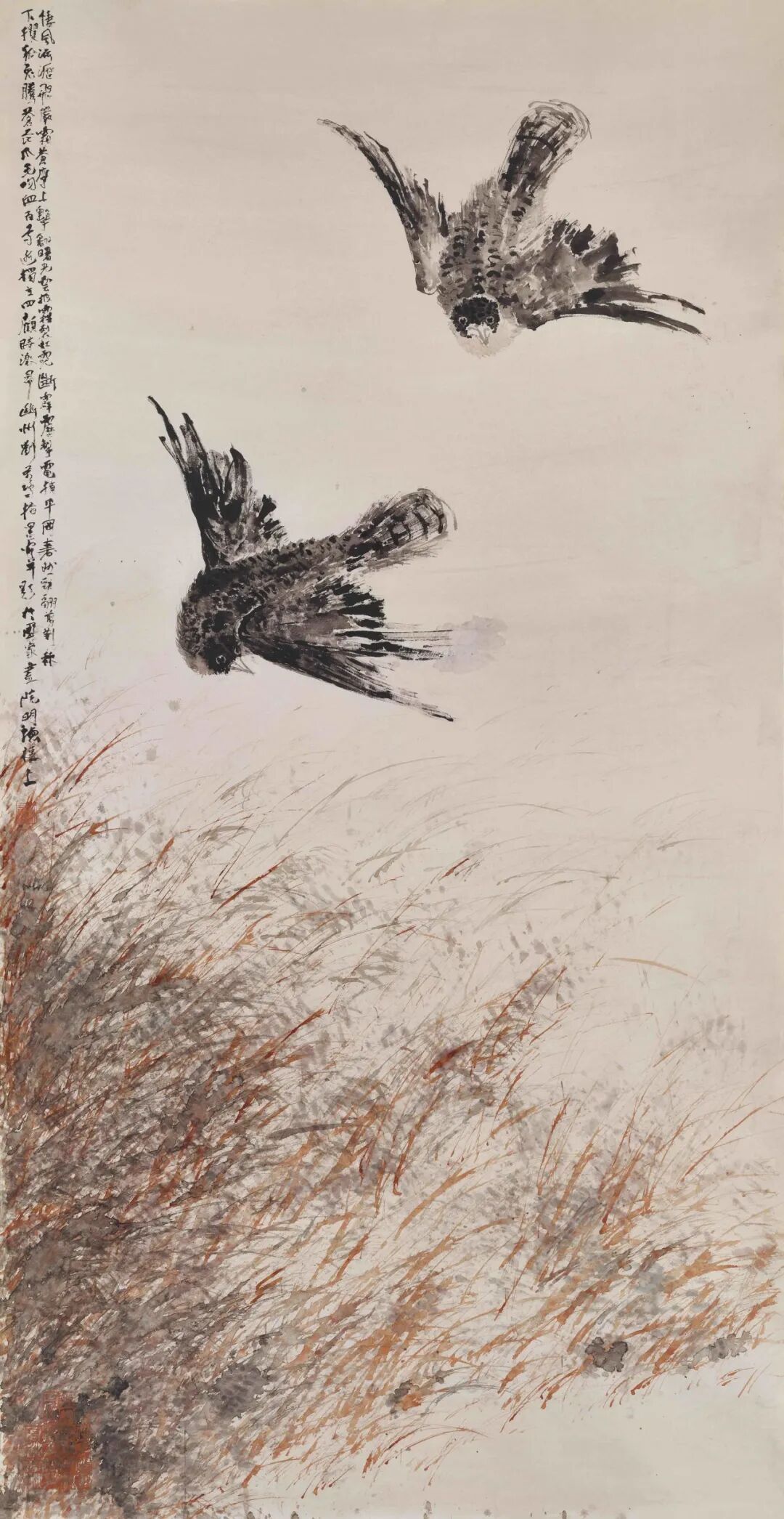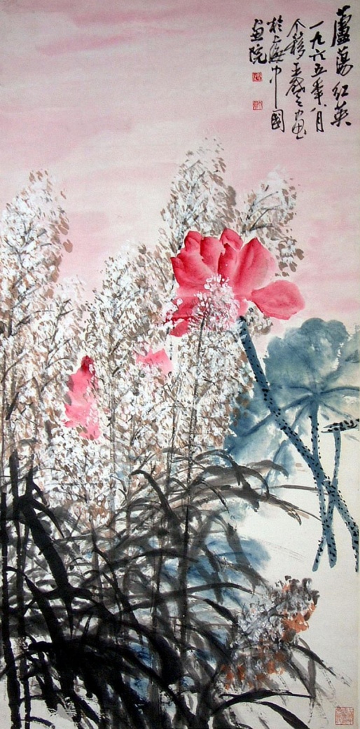 王个簃《芦荡红英》138cmx69cm 纸本设色 1965年
