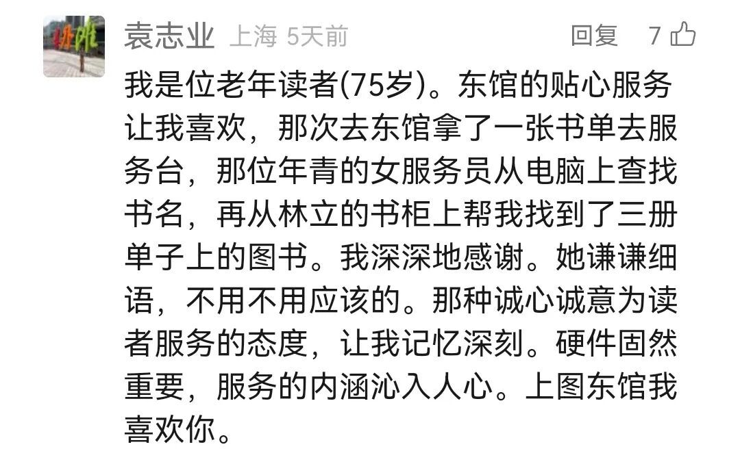 75岁的微信读者@袁志业在东馆感受到年轻馆员的温暖服务。年事已高的他拿来一张书单寻找自己要看的书籍,馆员热心地帮助了他找到三册书,令他感受到了东馆的温度!