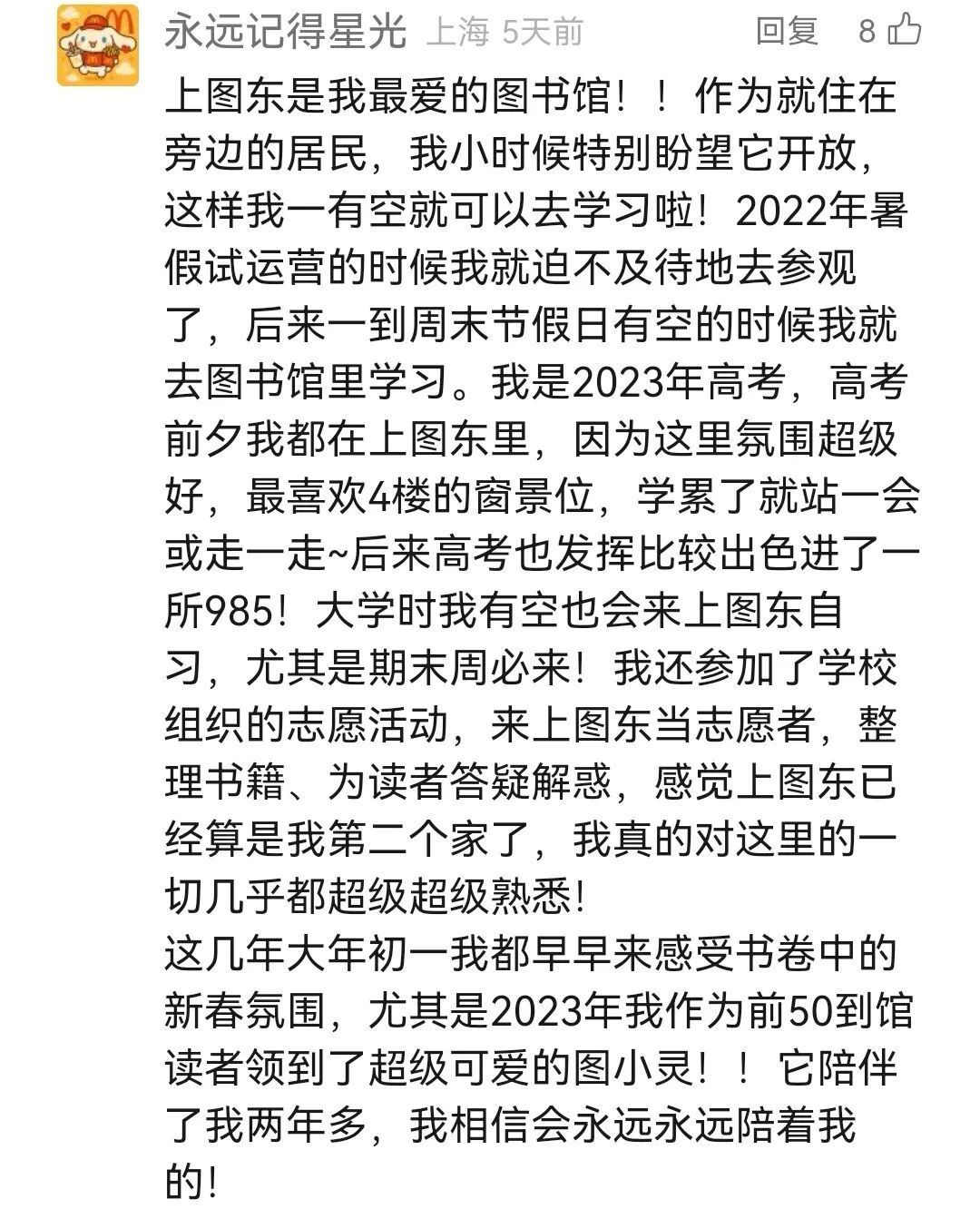 她到馆的最早记忆可以追溯到2022年东馆公测期间,她不仅一有空就来东馆学习,还参与了大学生志愿者服务。新春佳节进馆领到的可爱的“图小灵”玩偶,将会一直陪伴她成长。