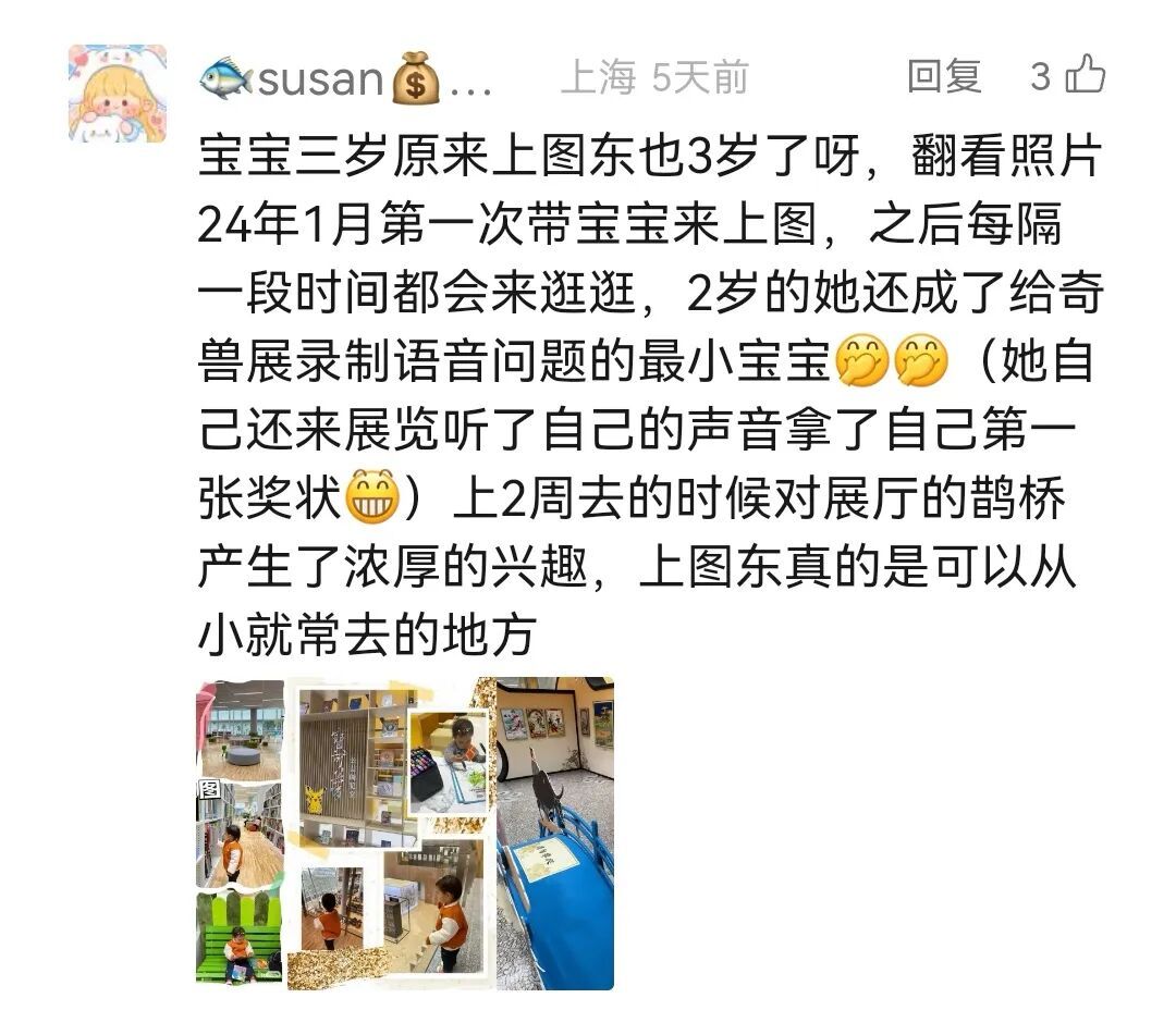 微信读者@susan的宝宝和东馆的“同龄”呢,还成为了“奇兽传说——跃然纸上的动物主题展”录制语音问题的最小宝宝,阅读兴趣从小开始培养!