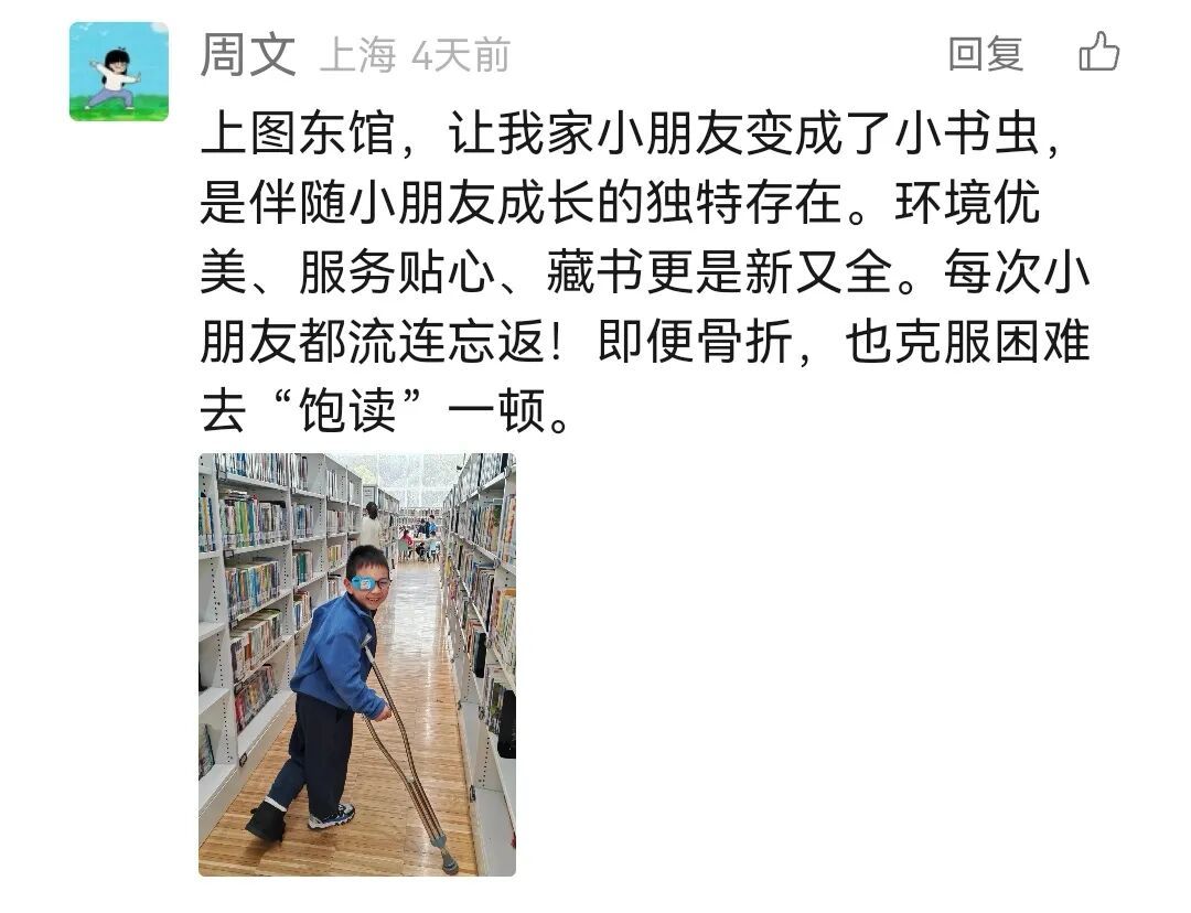 微信读者@周文分享了小朋友骨折时来东馆看书的画面,诙谐打趣道:“即使骨折,也克服困难'饱读'一顿。”