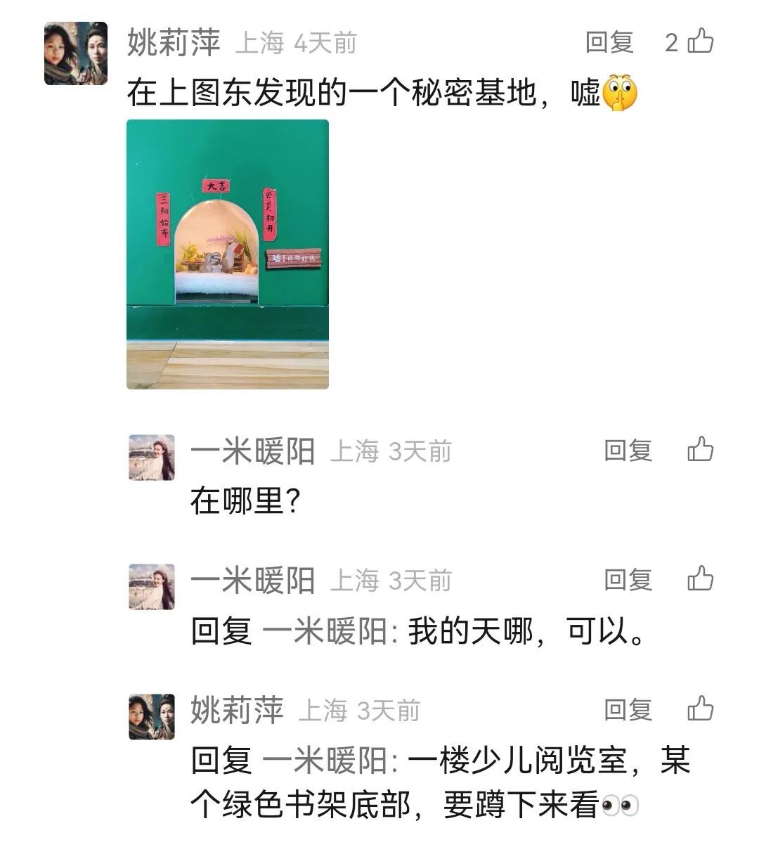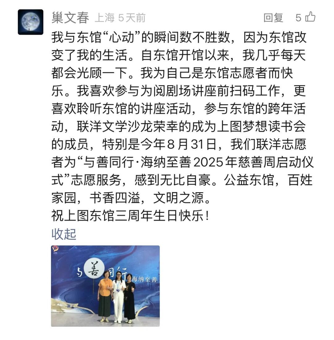 除了东馆的馆员们,还有一群热心的志愿者在东馆中默默奉献。微信读者@巢文春从开馆以来就是东馆的常客,也加入了志愿者的队伍。她所在的联洋文学沙龙也成了东馆的梦想读书会成员,绘就了上海社区退休群体晚年生活的新图景。