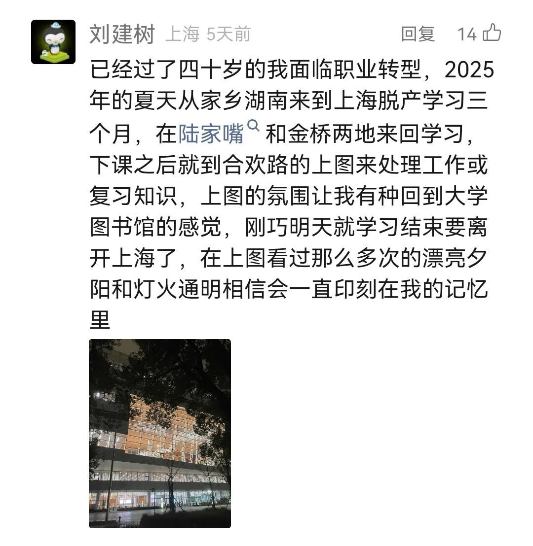 上周四晚发布征集文章后,微信读者@刘建树正要离开东馆,这也是他从湖南远赴上海脱产学习的最后一天。第二天,他就要告别上海这座城市,返回家乡。在这一刻,东馆的“漂亮夕阳和灯火通明”在他的脑海中留下了深刻的印记,每一天的学习氛围仿佛身处大学时的图书馆。