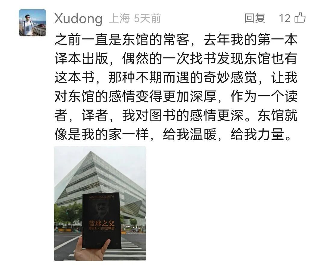 微信读者@Xudong在东馆发现了自己作为译者出版的书——《篮球之父:詹姆斯·奈史密斯传》,他形容这种是一种“不期而遇的奇妙感觉”!自己的译本出现在喜欢的图书馆,一切都是最好的安排。