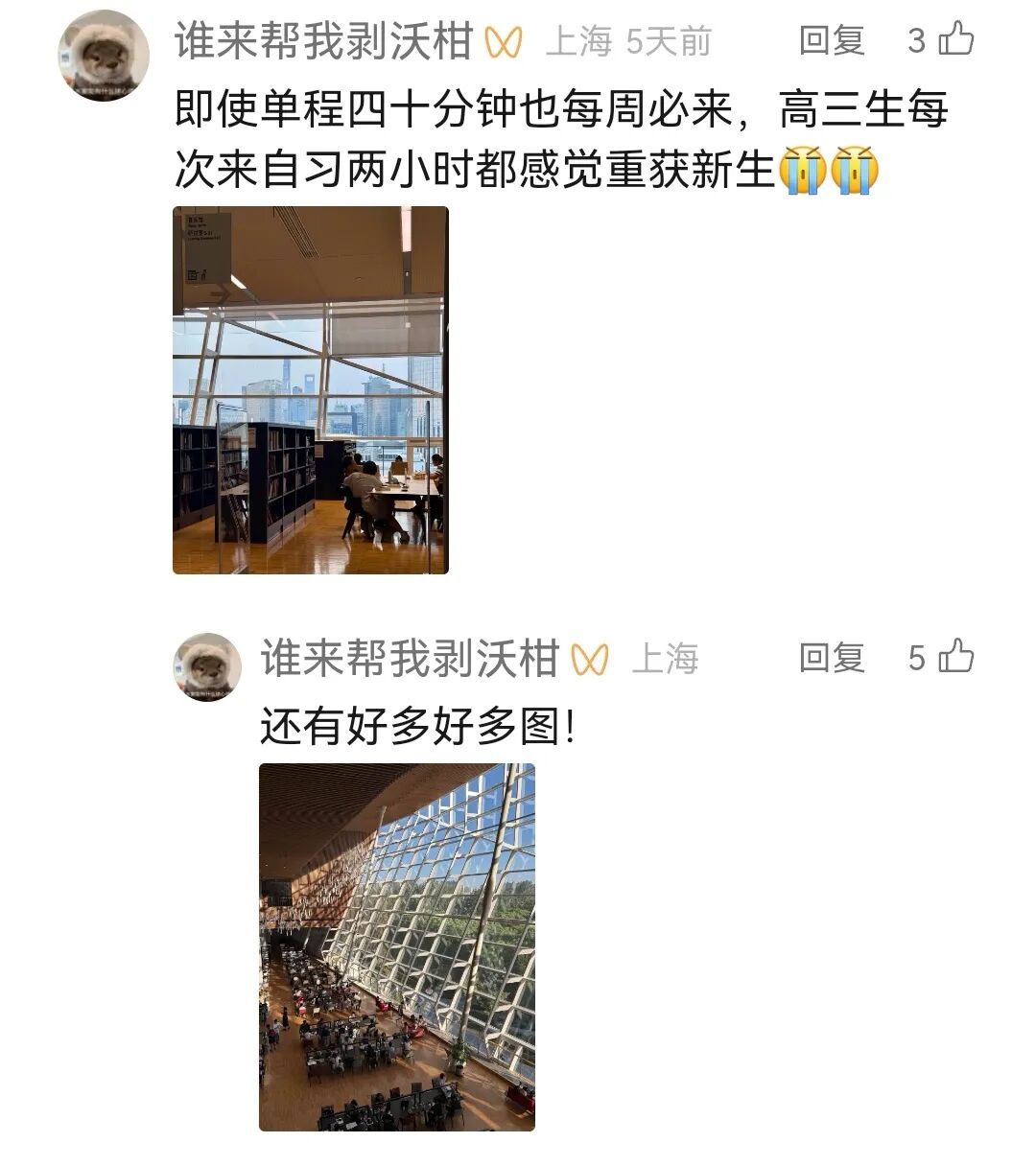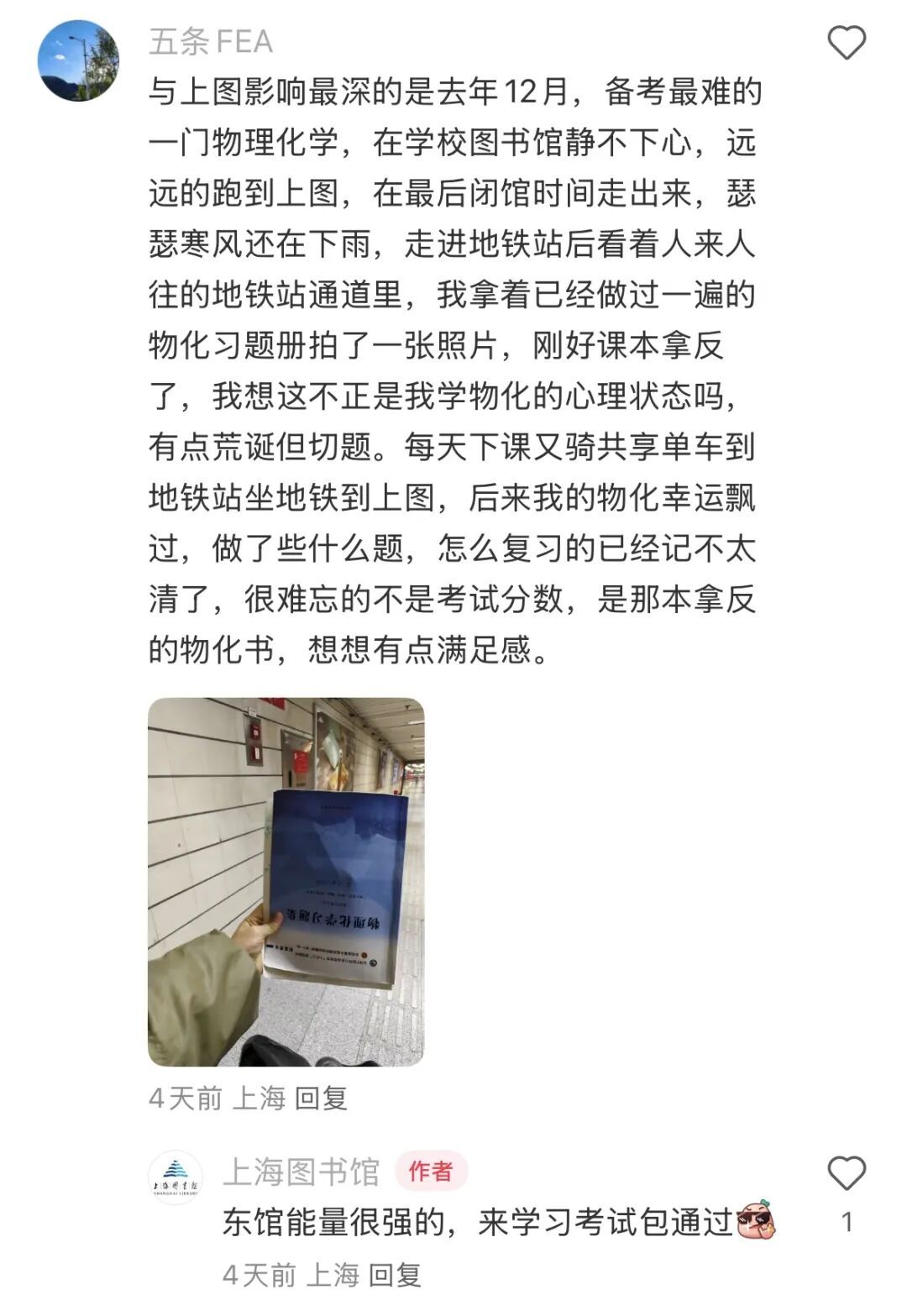 坐落在浦东世纪公园旁的上图东馆,对于有的读者来说距离不是很近。但是出于对东馆的喜爱,他们可是再远都要来呢!小红书读者@五条FEA记录了自己备考物理和化学的东馆回忆,瑟瑟寒风和雨水中,最终顺利通过了考试。
